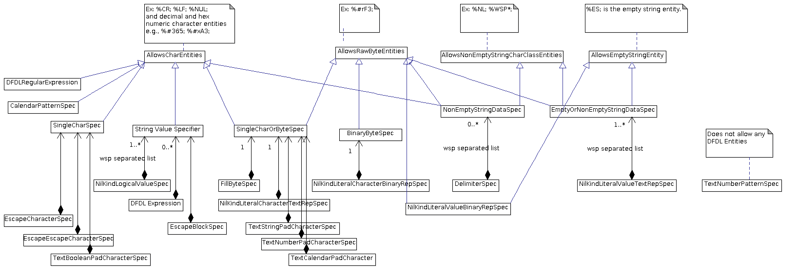 I was thinking about how to implement DFDL string literals. I went through the spec, and created a diagram which shows in a quasi-UML-class-diagram, what I think is the currently specified behavior of String literals and the properties that have them as their values. The diagram is attached. If this shows with black or other background instead of white, look for a setting on whatever you are using to view the png file. I had to set mine to white background as the default was an unreadable checkerboard. Some of the "classes" on here represent combinations of properties e.g., NilKindLiteralValueTextRepSpec means nilKind='literalValue' and representation="text". I think it is worth it to review this and see if we agree generally with what is allowed to specify a raw-byte entity and what is not, etc. Question: Can DFDL Regular Expressions include DFDL Entities? If so which kinds? I would assume (and in the drawing) that is only plain and numeric character entities, not raw bytes, and not character class entities. ...mikeb -- Mike Beckerle | OGF DFDL WG Co-Chair Tel: 781-330-0412